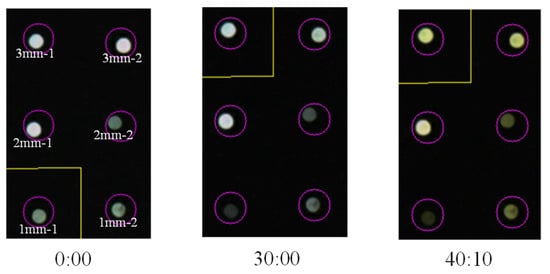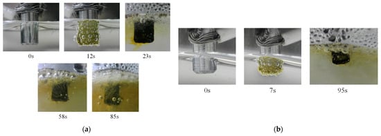 Given the diminutive dimensions of the dummy sensor, the corrosion experiment typically concluded within a maximum duration of approximately 3 min. Throughout this period, bubbles and yellowish/brownish liquid emerged on the surface of the dummy sensors as the electrolytic corrosion process progressed, as shown in Figure 34 for the experiment conducted in Case 2 (only one camera was used in Case 1).