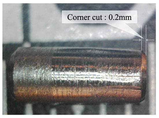 To create a compact dummy sensor, a steel rod with an outer diameter of 2.2 mm and a length of 5 mm was crafted. The rod was drilled from one side with a 1.0 mm diameter drill, leaving a corrosion thickness C on the opposite side. Figure 28 depicts two pieces of crafted steel rod, with one on the left displaying the POF insertion hole facing upward and the other on the right showing the face to be corroded pointing upward. The ruler in the background provides a scale of 1 mm per division. Figure 29 shows a side view of the dummy specimen.