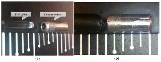 To complete the construction of the compact dummy sensor, the tip of the MAIN fiber was uncovered to expose a POF approximately 4–5 mm in length (Figure 30a). Subsequently, it was inserted and securely fixed into the dummy sensor using a small amount of instant adhesive (Figure 30b).