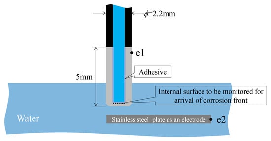 Figure 31 depicts the corrosion experiment conducted using the dummy sensor. The 5 mm long tip of the dummy sensor was submerged in water, establishing an electrical circuit by connecting an electric wire to point e1 on the top of the dummy sensor. Another electrode, point e2, was positioned inside the tank containing 5% salt brine. In this experiment, two dummy sensors with 0.2 mm and 0.4 mm corrosion thicknesses were corroded simultaneously, necessitating the installation of two electric circuits for each sensor. A magnified image of the immersed area is presented in Figure 32.
