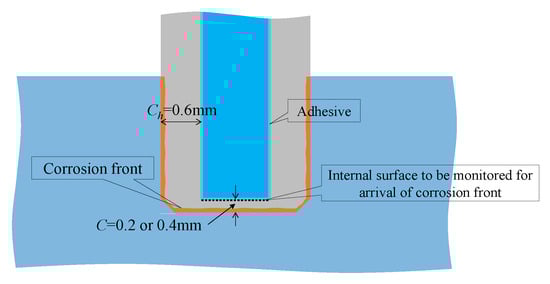 The dummy sensor’s body featured a wall thickness (denoted as Ch in the figure) of 0.6 mm. Additionally, a segment with a corrosion thickness designated as C was positioned at the bottom. Under these conditions, it is assumed that corrosion initiated from all immersed parts at the start of the electric corrosion experiment and that the corrosion zone propagated uniformly. Consequently, with a corrosion thickness C of either 0.2 mm or 0.4 mm at the bottom, which is smaller than Ch (0.6 mm), any alteration in the optical data recorded by the R2S sensor would indicate that the corrosion area, originating and spreading from the bottom, achieved a corrosion thickness of C.