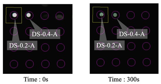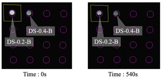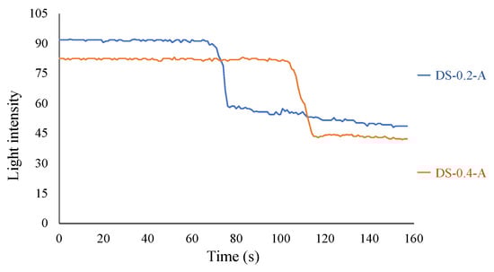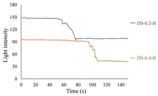 The results of Case 2 are depicted in Figure 36. In this instance, the light intensity of DS-0.2-B began to decrease at approximately 58 s and persisted for approximately 18 s before stabilizing. For DS-0.4-B, the reduction in light intensity initiated at 95 s, lasted for approximately 15 s, and then stabilized. These patterns mirror those observed in Case 1, thus substantiating the reproducibility of the corrosion experiments.