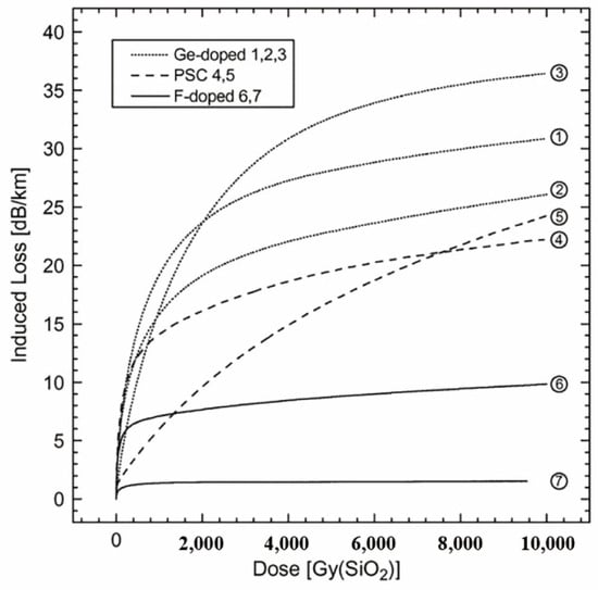 - Regnier, E.; Flammer, I.; Girard, S.; Gooijer, F.; Achten, F.; Kuyt, G. Low-dose radiation-induced attenuation at infrared wavelengths for P-doped, Ge-doped and pure silica-core optical fibres. IEEE Trans. Nucl. Sci. 2007, 54, 1115–1119. [Google Scholar] [CrossRef]