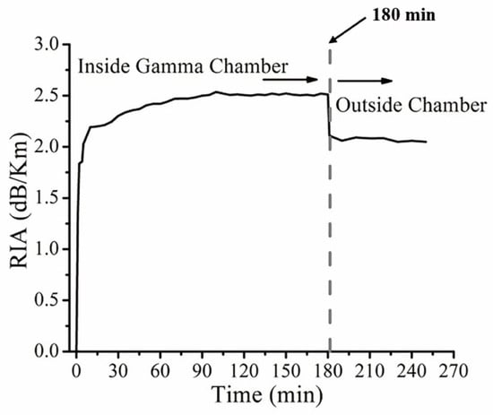 In 2016, Pal et al. presented a radiation-resistant fiber Bragg grating sensor utilizing fluorine-doped fibers [101]. Through experiments, they discovered that silicon-core fibers with fluorine-doped cladding, produced using an improved Modified Chemical Vapor Deposition (MCVD) method, exhibited exceptional transmission and radiation-resistant properties in the near-infrared region. After 180 min of gamma radiation exposure, the radiation-induced attenuation (RIA) level of the silicon-core fluorine-doped cladding fibers used could rapidly recover to its pre-irradiation RIA level, as illustrated in Figure 2.