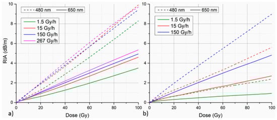The variation curves of RIA with increasing irradiation dose for two types of PF-POFs compared in the experiment by Stajanca et al. [102]. (a) Copolymer-catalyst-type PF-POFs; (b) non-copolymer-catalyst-type PF-POFs.