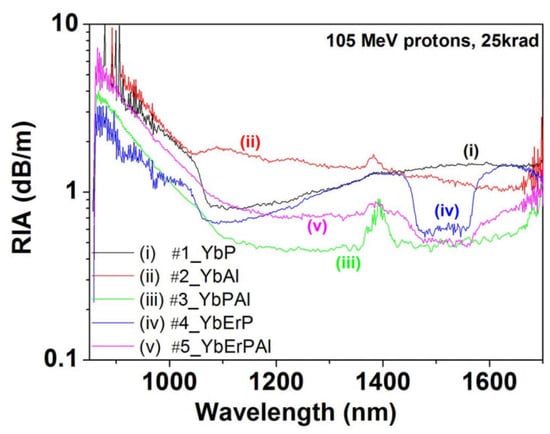 In the same year, S. Girard et al. reported their study on the effects of YDF and EYDF under irradiation [125]. Through exposure to 105 MeV proton and gamma-ray irradiation tests on five different fiber groups (YbP, YbAl, YbPAl, YbErAl, YbErPAl), the RIA was measured, as shown in Figure 4. The experimental results indicate that, compared to YDF, except for ytterbium–phosphorus–aluminum co-doped fibers, EYDF exhibits better spectral performance under irradiation, demonstrating that EYDF is an excellent candidate material for radiation-resistant EDFAs.
