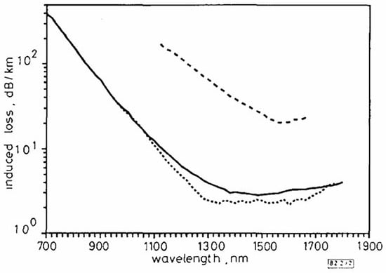 In 1995, Dianov et al. reported on a radiation-resistant core-doped nitrogen-doped silica fiber [126]. Under gamma-ray irradiation of 10 kGy for 1–2 h, the experimental results showed that the radiation-induced losses of the core-doped nitrogen-doped silica fiber in the range of 1300–1600 nm were very close to the optimal data from previous radiation experiments on pure silica fibers, as shown in Figure 5. This study suggests that core-doped nitrogen-doped silica fibers hold promise as radiation-resistant fibers.
