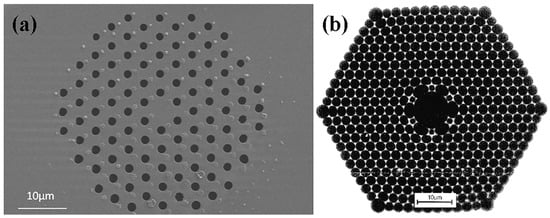Microstructured or photonic crystal fibers are increasingly utilized for sensor applications [157,158]. Two distinct types of fibers have been commercialized. The first type comprises TIR solid-core fibers with microstructured cladding, as illustrated in Figure 6a. The second type are Hollow-Core Fibers (HCFs), as illustrated in Figure 6b. HCFs consist of a core with air holes and a microstructured cladding. The light-guiding mechanism of these fibers differs significantly from TIR fibers, resulting in narrow transmission windows centered around wavelengths determined by the structural parameters.