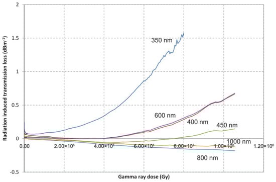 Optical fiber Bragg gratings (FBGs) and long-period grating (LPG) sensors within radiation-resistant core-doped nitrogen-doped silica fibers are promising candidates for sensor applications in nuclear and other radiation environments [127,128]. These materials demand high radiation resistance from the optical fibers employed [129,130]. In 1998, Vasiliev et al. reported on the performance of FBGs and LPGs made from core-doped nitrogen-doped silica fibers under gamma-ray irradiation [131]. The experimental results demonstrated the excellent radiation resistance of both the FBGs and LPGs fabricated using core-doped nitrogen-doped silica fibers under a dose of 1.46 MGy gamma-ray irradiation.