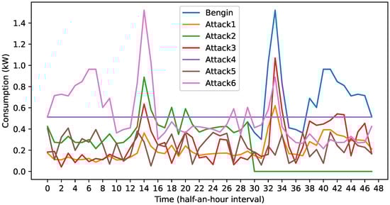 Visualization of a benign electricity usage sample and the corresponding malicious samples.