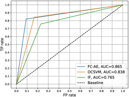 Furthermore, to visually compare the three experimented anomaly detectors, IF, OCSVM, and FC-AE, at various classification thresholds, Figure 4 and Figure 5 show the ROC and PR curves of the three detectors, respectively. An analysis of Table 2 along with Figure 4 and Figure 5 reveals that the FC-AE detector emerged as the top-performing anomaly detector among those examined. It demonstrated the highest values for ACC, DR, HD, F1, AUC-ROC, and AUC-P-R while exhibiting the lowest FNR. The superior performance of the FC-AE detector compared to shallow detectors such as IF and OCSVM can be attributed to the DL architecture of autoencoders. This architecture enables the FC-AE detector to unveil intricate electricity consumption patterns within the electricity consumption data, thereby enhancing the detection of electricity theft. Finally, upon comparing the performance of the FC-AE and CNN detectors against zero-day attacks, it becomes evident that the FC-AE anomaly detector achieved superior results. This is evidenced by an approximately 26% increase in the ACC, a 62% increase in the DR, a 53% increase in the HD, and a 45% increase in the F1, alongside a notable 62% reduction in the FNR.