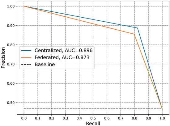 Table 3 compares the performance of the CL and FL-based anomaly detectors in terms of the ACC, PR, DR, FA, HD, FNR, and F1. Moreover, Figure 6 and Figure 7 compare the performance of the two types of detectors in terms of the AUC-ROC and AUC-P-R. The anomaly detector based on CL is deemed optimal when assuming consumers’ willingness to share private data with the EUC. Consequently, the FL-based anomaly detector’s performance should be evaluated in relation to this optimal detector. Analysis of the data and visuals reveals that the FL-based detector achieved comparable performance to its CL-based counterpart. The slight variance in performance between the two detectors is considered an acceptable trade-off for ensuring privacy. This underscores the effectiveness of our FL-based anomaly detector in safeguarding consumer privacy while accurately identifying zero-day attacks related to electricity theft.