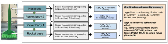 Figure 1. Shows an abstract illustration of the RI2AP method proposed in this work. Sensor measurements correspond to the health of different rocket parts. Several function approximations are then used to predict anomalous occurrences from the sensor measurements, and their outputs are combined using combining rules. The combining rules allow natural aggregation mechanisms, e.g., NOISY-OR and NOISY-MAX, as shown in the illustration.