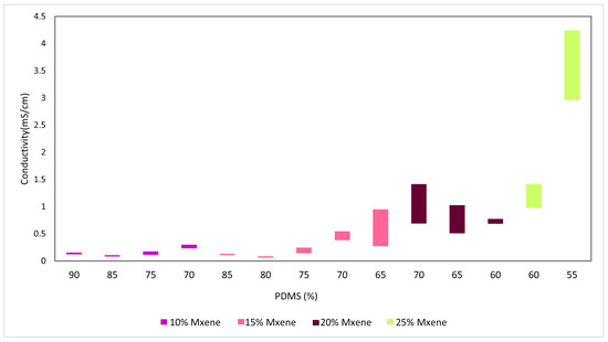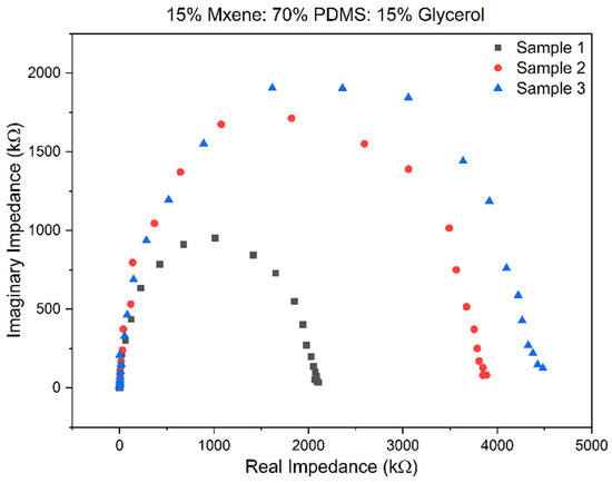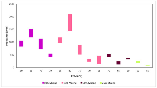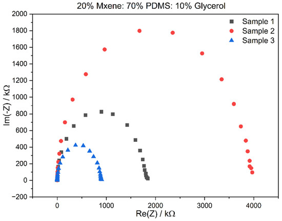 An extensive batch of samples was prepared to determine which combination of MXene: PDMS: glycerol exhibited the most favorable initial electrochemical properties. The criterion was that the sample should be able to withstand repeated electrochemical testing in a customized potentiostat cell without physical degradation and exhibit approximately the same low bulk impedance and high conductivity for a triplicate sample. The bulk impedance (obtained from the Nyquist plot of each sample as well as the EC-lab software v11.02 fitting) and conductivity (calculated using Equation (1) of the various samples are shown in Figure 1 and Figure 2. The range of the preceding values is also reported in the figures. In this case, and due to the small sample size, the range was selected instead of the standard deviation for better representation of the data variation.