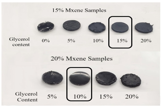 Pictures of samples after electrochemical testing was performed on each one. The highlighted sample compositions were chosen for further testing (Compositions 1 and 2, 15% and 20% MXenes, respectively).