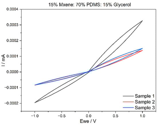 Cyclic voltammetry was carried out on the two compositions from which the voltammograms, current against time graphs and, as a result, charge storage density (CSD) were recorded. Figure 4 and Figure 5 exhibit the voltammogram curves for Composition 1 and Composition 2 in triplicate. The CSD was determined for a scan rate of 20 mV/s with an electrode thickness of 1 mm. These parameters were kept constant for all CV testing completed through the experimental work. From the above graphs plotted in Figure 6 and Figure 7, both the compositions have very stable oxidation and reduction cycles with the absence of peaks. It can also be deduced that Composition 2 has higher current density values, which can be attributed to the higher MXene content.