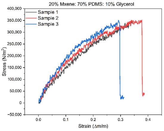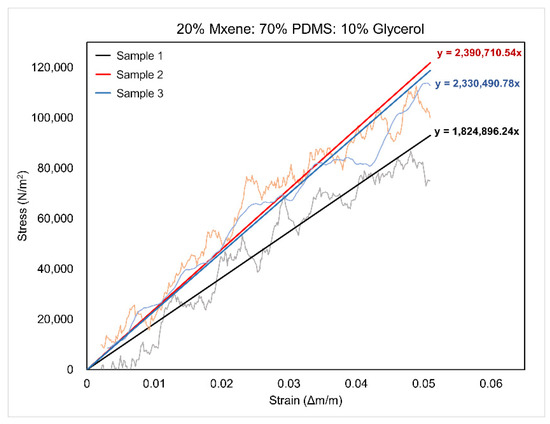 Three identical samples with dimensions of 52 mm in length, 7 mm in width, and 3 mm in height were fabricated for Compositions 1 and 2 to undergo mechanical testing. These samples were clamped in the tensile testing apparatus and stretched until failure in the form of breakage. The force applied and extension values were recorded, from which the stress–strain data were calculated and graphed. Figure 8 shows the stress–strain data for Composition 2. The average Young’s modulus was computed from the aforementioned graphs by determining the gradient of the elastic region, which corresponds to the linear portion starting from the origin, in the stress–strain graphs. This was completed by applying a trendline to those regions as shown in Figure 9. The results of the mechanical testing for Compositions 1 and 2 in comparison to other literature are shown in Table 3. Composition 2 has a lower Young’s modulus than Composition 1 and this was attributed to the increased content of the MXenes. Composition 2 also stretched by a higher percentage, meaning that the increase in MXene content made the final material more ductile. In general, for both compositions, these values are deemed satisfactory, considering that Young’s moduli fall within the range typical of skin properties (25 kPa–80 MPa under tensile and torsion tests) [35]. The prepared MXene-based samples demonstrated a notable level of flexibility comparable to that of skin tissue (25 kPa–80 MPa under tensile and torsion tests) [28,35].