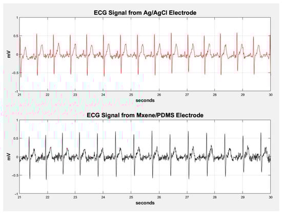The ECG and EMG testing was performed to see how the electrode material compares to commercially available electrodes like Ag/AgCl. As such, the same electrode was used as a control for these experiments, to which the MXene electrodes were compared. The signals from both electrodes were plotted along a shared time axis in MatLab. Figure 10 shows the comparison of the ECG experiment between Ag/AgCl electrodes and MXene/PDMS electrodes. Please refer to the Supplementary Materials section for the setup details and sample preparation (Figure S6).