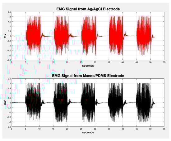 The PQRS regions are clearly visible in all segments of the ECG signals presented in the above figure for the MXene/PDMS electrode. The developed MXene/PDMS electrodes can detect biological signals from the skin with the same parameters used by commercial electrodes, however, there is slight noise in the MXene/PDMS electrode signal, but this can be attributed to not having enough gel at the skin–electrode interface. The MXene/PDMS electrode exhibits higher amplitude in certain peaks at seconds 26 and 27, suggesting potential increased conductivity compared to Ag/AgCl electrodes. Figure 10 illustrates the comparison of EMG signals between the Ag/AgCl electrodes and the MXene/PDMS electrodes. Figure 11 shows the contraction and relaxation of the bicep muscle in 5 s intervals. The contraction periods are aligned against a 50 s window for the signals of both electrode materials. The synthesized sample has excellent electrochemical and mechanical properties that make it best suited to flexible and wearable electronics sensing applications. The results of ECG and EMG recording prove that it can be concluded that the developed MXene/PDMS-based electrodes can also function as wearable flexible conductive electrodes for biosignal sensing on the skin.