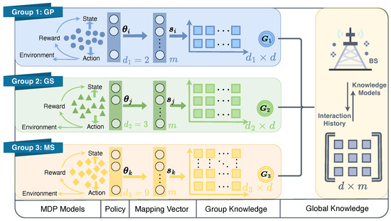 To facilitate knowledge sharing among groups and within each group, a three-layered knowledge base is designed as in Figure 3. A global knowledge base, , serves as the shared knowledge among groups. Three group-based knowledge matrices, denoted as , where , are also utilized to store the knowledge specific to each group. These matrices serve as a bridge between the global knowledge base and equipment-specific mapping vectors, represented by , where . As demonstrated by the MDP models of each group, the state and action spaces of each group can vary. In other words, the dimensions of the MDP policies, i.e., , , and , have different dimensions , as illustrated in Figure 3. However, due to the existence of varied group knowledge bases , the variations of the policy vectors are mapped to the same space. This enables the achievement of a global knowledge base that can be shared across different domains. As a result, the policy parameters of each equipment can be obtained as: