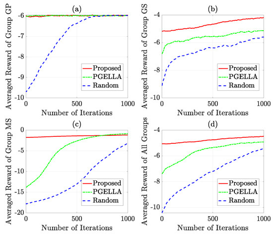 In Figure 5, a comprehensive overview of the learning trajectory is depicted across 1000 iterations for three groups. The implementation of more effective warm start policies can significantly reduce the convergence time for each group. This underscores the impact of initial policy selection on the efficiency of the learning process. In Figure 5a, it is evident that for group GP, both PGELLA and the proposed algorithm demonstrate improved warm start policies compared to the random initial policy. This enhancement effectively improves the performance of the initial policy. Additionally, both methods exhibit similar convergence speeds and final convergence performance. This similarity may be attributed to the simpler Markov models in group GP. These simpler models require less demanding algorithms to achieve satisfactory performance. In other words, PGELLA suffices for simpler models, despite lacking extensive knowledge collection and migration capabilities. Figure 5b illustrates that the enhanced capacity for broader exploration facilitates attaining globally optimal solutions. In Figure 5b, for group GS, our proposed algorithm significantly enhances the performance of the warm start policy and outperforms both PGELLA and random PG algorithm in terms of convergence speed. This improvement stems from the ability of the proposed algorithm to learn cross-domain knowledge and migrate accumulated knowledge from other domains to the current one, potentially achieving global optimality or sub-optimality and breaking out of local optima. It is worth noting that PGELLA also achieves superior results by enabling knowledge sharing within group devices, which helps overcome local optimality limitations. In Figure 5c, it can be observed that both PGELLA and the proposed algorithm achieve notable improvements in warm start policies compared to the random PG algorithm. Particularly, the proposed algorithm exhibits a significant enhancement, consistent with the performance of warm start depicted in Figure 4. Additionally, although PGELLA also contributes to the improvement in convergence rate, the algorithm proposed outperforms the other two algorithms significantly in terms of convergence speed. This is attributed to our proposed algorithm’s capability in cross-domain knowledge transfer, enabling it to achieve greater performance improvements on complex models than on simpler ones. In Figure 5d, the average performance of different algorithms across three groups is presented. Based on the averaged results, it can be observed that overall, both in terms of warm start policies performance and convergence rate, our proposed algorithm outperforms PGELLA. In a nutshell, while the performance in each single group can vary, our algorithm shows better overall performance in respect to warm start policy and convergence speed.