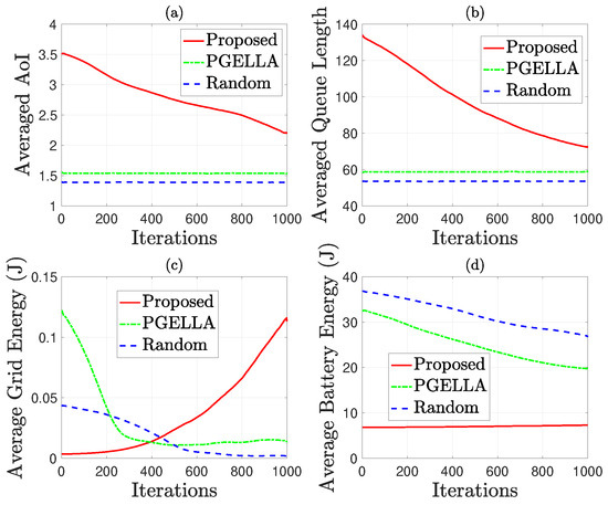 Figure 6 considers the default groups and environmental settings as specified in Section 4.1. In this scenario, mixed energy sources, including grid power energy and green harvested energy, are considered to minimize grid energy consumption. In a nutshell, our proposed method can achieve a better balance between grid energy consumption, battery energy consumption and AoI. By contrast, the other methods, such as PGELLA and Random methods, fail to optimize the overall performance. This proves the sustainability improvement of our proposed method. To be specific, Figure 6 shows the performance attributes for the MS group, encompassing average AoI, queue length, grid energy consumption and battery energy consumption. This group is selected due to its model complexity, allowing for a more comprehensive comparison of the algorithms. Three algorithms are considered: random PG with a random initial policy, PGELLA with intra-group knowledge sharing capability, and the proposed algorithm, the cross-domain knowledge migration algorithm. Figure 6a demonstrates the significant impact of the proposed algorithm on reducing AoI as the number of learning steps increases. In contrast, algorithms with random initial policies or PGELLA exhibit inferior performance in this regard, albeit the latter showing initial superiority compared to random initial policy. Figure 6b reveals a similar trend in average queue length reduction across all the devices in the group MS with the algorithms proposed, indicating enhanced packet processing efficiency. Notably, queue length is closely correlated with AoI. A notable difference in grid energy consumption among the three algorithms is evident in Figure 6c. While both the random initial policy and PGELLA show a decrease in grid energy consumption with increasing learning steps, our proposed algorithms exhibits an increase. However, it’s essential to highlight that this aligns with our goal of minimizing balanced cost. Our method achieves a better balance between AoI and grid energy consumption. Figure 6d indicates relatively consistent performance among the three algorithms in terms of battery energy consumption. The stability in battery energy consumption observed with the proposed algorithms is attributed to the significant performance enhancement with minimal energy consumption in the grid power network. Conversely, the battery energy consumption of the other two algorithms decreases with increasing learning steps, through with limited performance enhancement. Additionally, the PGELLA exhibits lower battery energy consumption than the random initial strategy.