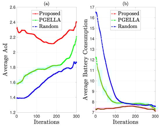 As depicted in Figure 7, the performance of group GS is evaluated in terms of average AoI and average battery energy consumption. From Figure 7a, it’s evident that the performance of all three algorithms improve as the number of learning steps increases. Particularly, the initial AoI of the random PG is lower than the other two algorithms, and this trend persists as the number of learning steps increases. In Figure 7b, the battery energy consumption of all three algorithms decreases with the increase in the number of learning steps. This reduction in energy consumption is accompanied by an increase in average AoI, indicating the optimization of multiple parameters rather than a single objective. Notably, the algorithms proposed demonstrate superior optimization for average energy consumption compared to the other two algorithms. While all algorithms exhibit a significant decrease in average energy consumption with increasing learning steps, the proposed algorithms perform the best in terms of overall performance improvement across multiple parameters, as demonstrated in Figure 5b.