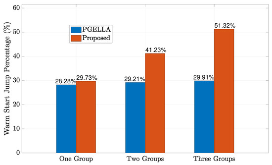 In Figure 4, we examine the initial performance improvement of the two algorithms, which we refer to as the warm start policy, compared to the random initial policy. Figure 4 shows the improvement of warm start policies of our proposed method and PGELLA over random initial policies. Both methods surpass the random initial policies. To be specific, the overall averaged results show that our algorithm can achieves warm start policy improvement over random policy while PGELLA achieves in general. As shown in Figure 4, for the devices in group GP, the proposed algorithm can provide a slight better performance compared to PGELLA. This is because the group GP, with lower complexity, requires less knowledge from other domains. Therefore, simpler intra-cluster knowledge sharing and migration models can provide satisfactory performance compared to cross-domain methods. Furthermore, for both the group GS and group MS, the proposed algorithm obviously outperforms PGELLA. Particularly for the MS group, the algorithm proposed can achieve a performance improvement of compared to the random initial policy, while a performance improvement can be achieved by PGELLA. The differing performance of the algorithm proposed and PGELLA across different groups can be attributed to the varying model complexities of these groups. The proposed algorithm enables cross-domain knowledge sharing, leading to a higher degree of exploration for complex models and the ability to migrate learned knowledge to new tasks. The enhanced performance of our method is attributed to its capacity to retain a broader spectrum of knowledge, while PGELLA is limited to providing insights specific to individual groups.