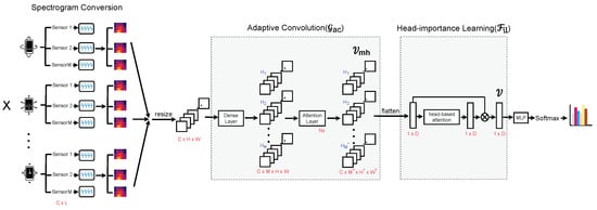 Given a sequence of sensor data vectors that is converted to spectrograms , S is then mapped to by a self-attention-based adaptive convolution module (see details in Section 3.3). This is followed by a head-importance learning module , where each head generated from the self-attention is weighted based on its importance (see details in Section 3.4). After is obtained, classification is performed using two fully-connected layers (MLP) consisting of RELU and Softmax, with the cross-entropy used as the loss function when optimizing the classification.