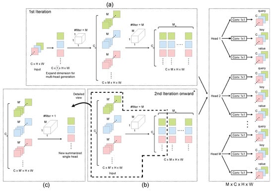 Architecture of the dense layer. * The last layer squeezes the features from the channel dimensions to obtain the global features. (a) shows the first iteration where the input tensor is expanded to facilitate the generation of multiple independent attention heads through a double-layer convolution block. (b) illustrates the procedure from the second iteration onward, where a single-layer convolutional block is used for generating the multiple attention heads, continuing the process of feature refinement. (c) provides a detailed view of how each attention head is further processed to summarize and refine the features extracted, helping enhance the network’s ability to focus on relevant features. The detailed introduction provided in the section on the “dense layer” effectively reflects the operations and configurations depicted in the figure.