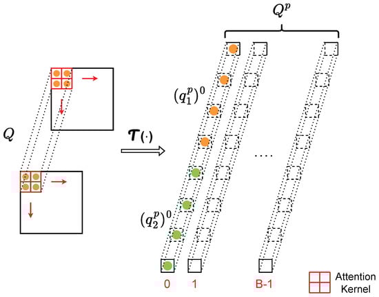 To be more specific, considering a self-attention module with a single head, we first extract the respective patches from Q, K, and V. After assigning the , groups B of the patches can be obtained from each channel (i.e., spectrogram) in Q, K, and V. Thus, C channels can extract patches with shape in each of Q, K, and V: