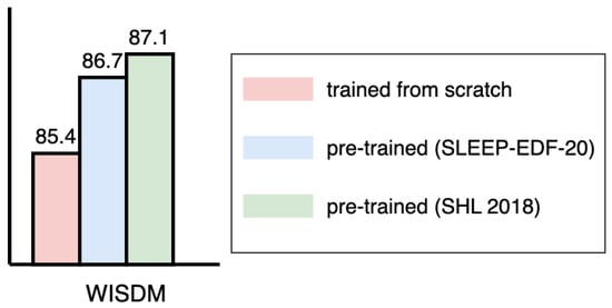 Figure 6 presents the model performance on WISDM using the pretrained SensorNet obtained from SLEEP-EDF-20 (pretrained SensorNet (SLEEP-EDF-20)). The performance when using the pretrained SensorNet (SLEEP-EDF-20) () is lower than when using the pretrained SensorNet (SHL 2018) (), indicating that the pretrained SensorNet with the same type of data can learn more related knowledge.