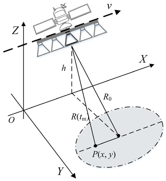 Figure 1 depicts the imaging geometry of an azimuth multi-channel SAR system. The platform flies along the x-axis at a constant speed, v , and maintains a fixed altitude, h . It transmits a wide-band signal via the reference channel, and all channels simultaneously receive the echoes. Through phase compensation [9], the echoes generated by a multi-channel SAR system can be made equivalent to those of a single-channel SAR system. It is assumed that a multi-channel HRWS SAR system has M channels. The antenna phase center (APC) of the m th channel is x m , 0 , h at the time t = 0 and x m + v t , 0 , h at time t . The echoes reflected from point P x , y and received by the m th channel at time t are given in [26].