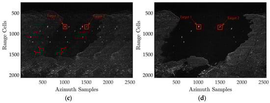 The experiment presents the SAR imaging data obtained from both the subspace projection algorithm and our proposed approach, with and without phase calibration. These findings are shown in Figure 4a–d. Figure 4a clearly demonstrates that the imaging findings are significantly affected by the random phase errors between channels, resulting in noticeable ambiguities and blurring. The magnified sub-images clearly reveal the ambiguous components of ship targets, which would be considered as actual ships throughout the detection procedure. However, in the first experiment with a high signal-to-noise ratio (SNR), the findings from both calibrations, using multiple channels, effectively minimize ambiguity by employing the same spatial filtering technique. The inherent ambiguity components depicted in Figure 4a are effectively mitigated in the context of visual perception. This experiment illustrates that, in the presence of imbalanced phase errors, calibration processing is essential to attain an optimal level of ambiguity suppression performance.