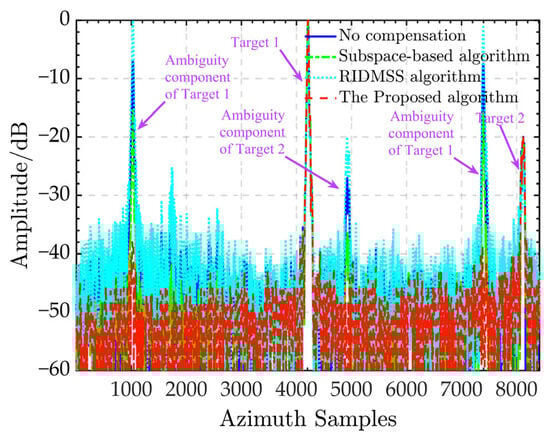 Figure 5 depicts the azimuth profile to further demonstrate the ghost suppression performance of each algorithm in Figure 4. The subspace-based algorithm’s azimuth ambiguity-to-signal ratio (AASR) is roughly −16 dB, as seen in the figure. The AASR of the RIDMSS is around 2.2 dB due to the algorithm’s erroneous augmentation of the ambiguous component, while suppressing the genuine echo. Unlike the previous two, the suggested algorithm has an AASR of around −38 dB and efficiently removes the ambiguous components of both targets 1 and 2, indicating the effectiveness of the proposed approach.