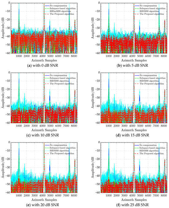 It is evident that the subspace-based algorithm achieves an AASR ranging from −10 dB to −20 dB. As the SNR increases, the AASR gradually improves. Furthermore, the proposed algorithm achieves better AASR performance compared to the subspace algorithm. The AASR quickly decreases from −22 dB to approximately −41 dB, as the SNR varies between 0 dB and 10 dB. When the SNR exceeds 10 dB, the AASR stabilizes around −40 dB. On the other hand, the RIDMSS algorithm exhibits the poorest AASR performance due to its inability to mitigate range-dependent errors. In summary, the AASR curves show that, in the presence of range-dependent channel phase errors, the suggested algorithm outperforms the other two algorithms in terms of robustness for HRWS SAR data.