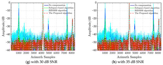 Furthermore, to demonstrate the robustness of the proposed algorithm, we used the MATLAB function AGHWN to add white Gaussian noise into the sentinel-1 radar data before pulse compression, resulting in different HRWS SAR data with signal-to-noise ratio (SNR) ranges ranging from 0 to 35 dB. We perform channel balance experiments with different SNRs using all algorithms based on this dataset. Their azimuth profiles are depicted in Figure 6. According to Figure 6a–h, the performance of the subspace-based approach improves marginally as the SNR increases, but the optimal AASR is never greater than −20 dB. The performance of the RIDMSS algorithm does not change significantly and the ghost energy remains comparable to the actual echo. Unlike the previous two algorithms, the suggested algorithm’s performance degrades slightly at low SNR, such as 0 and 5 dB, with an AASR of −22 dB and −27 dB, respectively. When the SNR increases, the AASR rapidly reaches −40 dB and remains steady. The suggested algorithm offers higher noise robustness than the previous two algorithms.