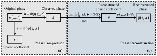 (a) The compression and (b) reconstruction process of the phase signal based on compressed sensing.