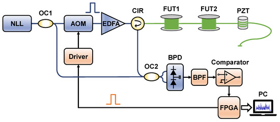 The experimental setup. NLL: narrow linewidth laser; OC: optical coupler; AOM: acousto-optic modulator; EDFA: erbium-doped fiber amplifier; CIR: optical circulator; FUT: fiber under test; PZT: piezoelectric transducer; BPD: balanced photodetector; BPF: bandpass filter; FPGA: field-programmable gate array; PC: personal computer.