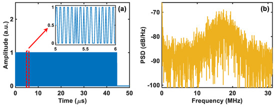 (a) The beat signal’s trace of one complete period acquired by the comparator and (b) the corresponding power spectrum density (PSD).