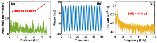 Then, a 500 Hz and 5 Vpp (peak-to-peak voltage) sinusoidal driving signal is applied on the PZT to simulate the external vibration. By using the moving differential method, the vibration location result based on the amplitude information is shown in Figure 4a. It can be clearly determined that the vibration signal is located at 4502 m, which is consistent with where the PZT is placed. After phase demodulation, the demodulated vibration waveform at 4502 m and the corresponding PSD are depicted in Figure 4b,c, respectively, from which we can see that the demodulated vibration signal is exactly the 500 Hz sinusoidal signal and its SNR is about 44.8 dB. The above results show that the comparator-based ultra-low-sampling Φ-OTDR system can accurately detect the vibration signal.