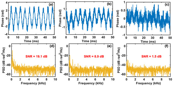 However, ultra-low sampling rate and sampling resolution will inevitably cause an increase in the system’s quantization noise. Especially when the vibration signal’s intensity is not large, the detection SNR will be seriously deteriorated. Thus, we continuously decreased the applied vibration intensity to observe the performance of the demodulated vibration signal. The PZT is driven by 200 Hz sinusoidal signals with amplitudes of 1 Vpp, 300b mVpp, and 100 mVpp, respectively. Figure 5a–c show the corresponding demodulated vibration waveforms. It is obvious that as the amplitude of the driving signal decreases, the demodulated waveform becomes increasingly rough and distorted. Especially when the driving voltage is 100 mVpp, the demodulated vibration waveform has been severely distorted, where we can hardly distinguish the sinusoidal waveform. The PSDs of these demodulated waveforms are plotted in Figure 5d–f, respectively, where we can obtain that the corresponding SNRs are 19.1 dB, 8.9 dB, and 1.5 dB. The serious deterioration of the detection SNR indicates that the comparator-based ultra-low-sampling Φ-OTDR system has a poor performance in detecting small vibration signals due to the influence of increased quantization noise.