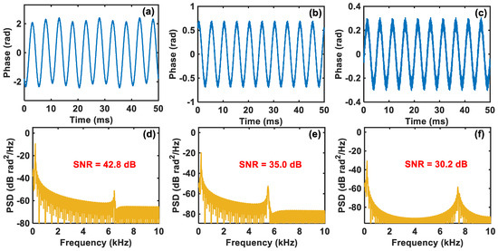 The corresponding PSDs of the reconstructed vibration waveforms are plotted in Figure 6d–f, respectively, from which we can know that their SNRs are 42.8 dB, 35.0 dB, and 30.2 dB, respectively. Compared with the original results shown in Figure 5d–f, the noise floors in Figure 6d–f are obviously lowered, indicating that the disruptive noise is suppressed, and the SNRs are significantly improved by 23.7 dB, 26.1 dB, and 28.7 dB, respectively. Therefore, the compressed sensing technique can effectively enhance the SNR of phase demodulation in the comparator-based ultra-low-sampling Φ-OTDR system, thereby greatly improving the system’s detection ability to detect small vibration signals. It is worth mentioning that the PSDs in Figure 6d–f have different second peak interferences, which are introduced during the compression and reconstruction process of the vibration signals and are related to the vibration signals’ SNR, the parameters of the reconstruction algorithm, etc.