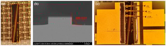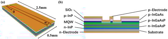 To achieve a wide gain bandwidth and low polarization in the SOA, we devised a narrow-ridge tilted waveguide SOA, as shown in Figure 1a. The device measures 2.5 mm in length and 0.5 mm in width. The epitaxial structure was grown using a metal–organic chemical vapor deposition (MOCVD) system on an InP substrate to ensure high-quality epitaxy, as shown in Figure 1b.