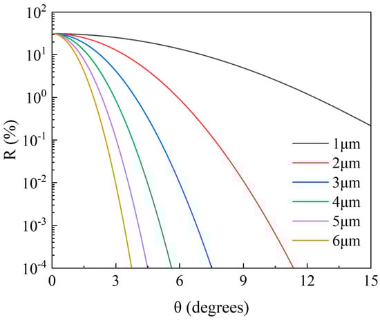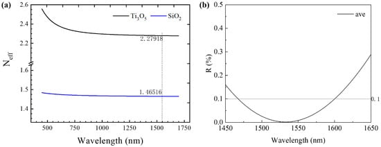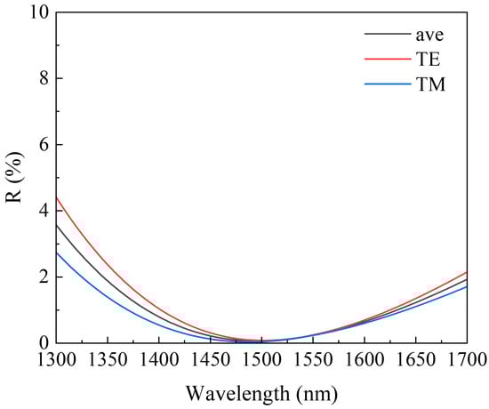 From Equation (21), it can be seen that a range of extreme values of R exists at optical film thicknesses ndcosθ of integer multiples of 1/4 wavelength. Substituting Equations (19) and (20) into (21), we can obtain the simulation curves of reflectivity for different polarization states in a single-layer AR film, as shown in Figure 4. From the reflection curves of TE and TM modes, it is evident that there is a certain disparity in the reflectance compared to the average reflectance curve at a 7° tilt angle. Specifically, the low reflectance band of the TE mode is narrower than that of the TM mode, indicating that losses in the TE mode will be greater than those in the TM mode at the boundaries of the gain bandwidth. While the average reflectance can achieve nearly 0.1% reflectance at the central wavelength, the wavelength range with reflectance below 0.1% is only around 45 nm, which cannot meet the amplification requirements of SOAs with wide bandwidths. Therefore, to meet the demands of SOAs with wide bandwidths, it is necessary to employ multi-layer ultra-broadband AR films.