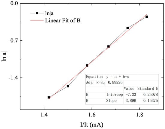 where Rs is the cavity surface reflectivity in the case of uncoated surface, which is usually 0.32. From Equations (22), (23) and (26), we can take I/It at different threshold currents as the independent variable and ln|a| as the dependent variable and take a number of points with I/It < 1.5 for straight line fitting. The cavity surface reflectivity of the AR film can be obtained from the slope k and the intercept b of the straight line, which can be expressed as follows: