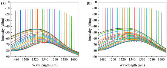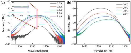 In the experiment, we investigated the performance of the SOA device by controlling the temperature and driving current. Initially, under TEC temperature conditions of 20 °C, we measured the amplified spontaneous emission (ASE) spectrum of the SOA under test. As shown in Figure 9a, the ASE spectrum was centered around 1520 nm. With an increase in the driving current, the ASE spectrum gradually broadened, and there was a noticeable increase in ASE power in the longer wavelength region. Subsequently, we set the driving current to 1 A and varied the TEC temperature to 10 °C, 20 °C, 30 °C, and 40 °C, respectively, to test the change in ASE power of the SOA. As shown in Figure 9b, the ASE power of the SOA significantly decreased with increasing temperature. With the increase in current or temperature, the ASE spectrum underwent a redshift. As previously discussed during the quantum well design, the material gain center was biased towards shorter wavelengths for this reason. Following the redshift, the ASE spectrum center approached 1550 nm, consistent with expectations.