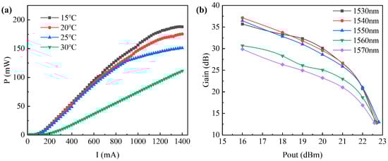 In the experiment, we configured the laser wavelength to 1550 nm and regulated the input signal power to 6 dBm. Subsequently, we tuned the TEC temperature to 15 °C, 20 °C, 25 °C, and 30 °C, respectively. We then proceeded to examine the drive current and output power profiles of the amplifier, as depicted in Figure 10a. The experimental findings unveil that the SOA enters the domain of linear amplification as the driving current escalates to 0.1 A, achieving a stabilized gain. The power exhibits linear growth, gradually approaching saturation after the driving current surpasses 1 A. The SOA demonstrates heightened stability at 15 °C, 20 °C, and 25 °C, yet evinces a conspicuous decline in power at 30 °C. Specifically, the output power of the SOA registers at 188 mW when the driving current reaches 1.4 A under a TEC temperature of 15 °C.