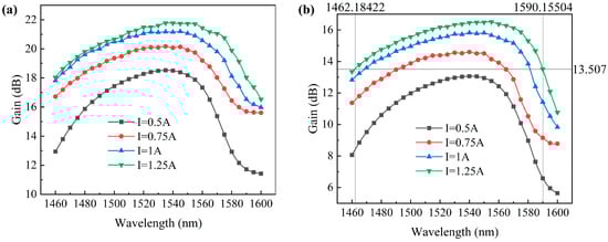 Gain curves of SOA to under test in the range of 1460–1600 nm with different driving currents: (a) laser power Pin = 0 dBm; (b) laser power Pin = 6 dBm.