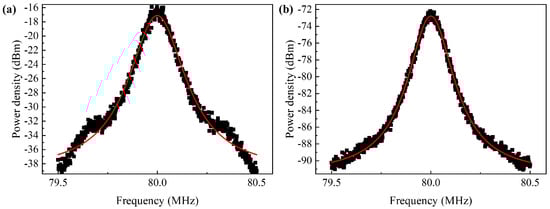 In the experiment, we set the power of the seed source laser to 6 dBm, drove the current to 1 A, and maintained the TEC temperature at 20 °C. Using a delayed self-heterodyne linewidth measurement system, we obtained and compared the linewidths of the laser source and the SOA output, as shown in Figure 14. According to the Lorentzian fitting results, which is the red line in the picture, the linewidth of the laser signal was 75.45 kHz, and after amplification by the amplifier, the linewidth of the output light was 77.9 kHz, indicating a mere 1.032-fold broadening of the signal light’s linewidth. A smaller linewidth broadening after amplification suggests that narrower channel spacing can be allowed for DWDM applications, allowing for more channels within the band. The SOA designed in this study exhibits minimal linewidth broadening, implying minimal impact on the linewidth of the signal light when used as an optical amplifier in communication systems, indicating lower requirements for the linewidth of the signal light source compared to conventional amplifiers.
